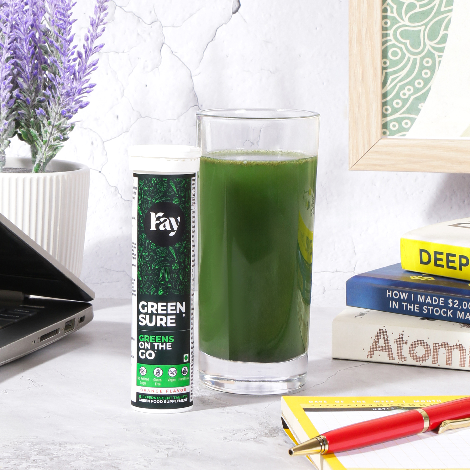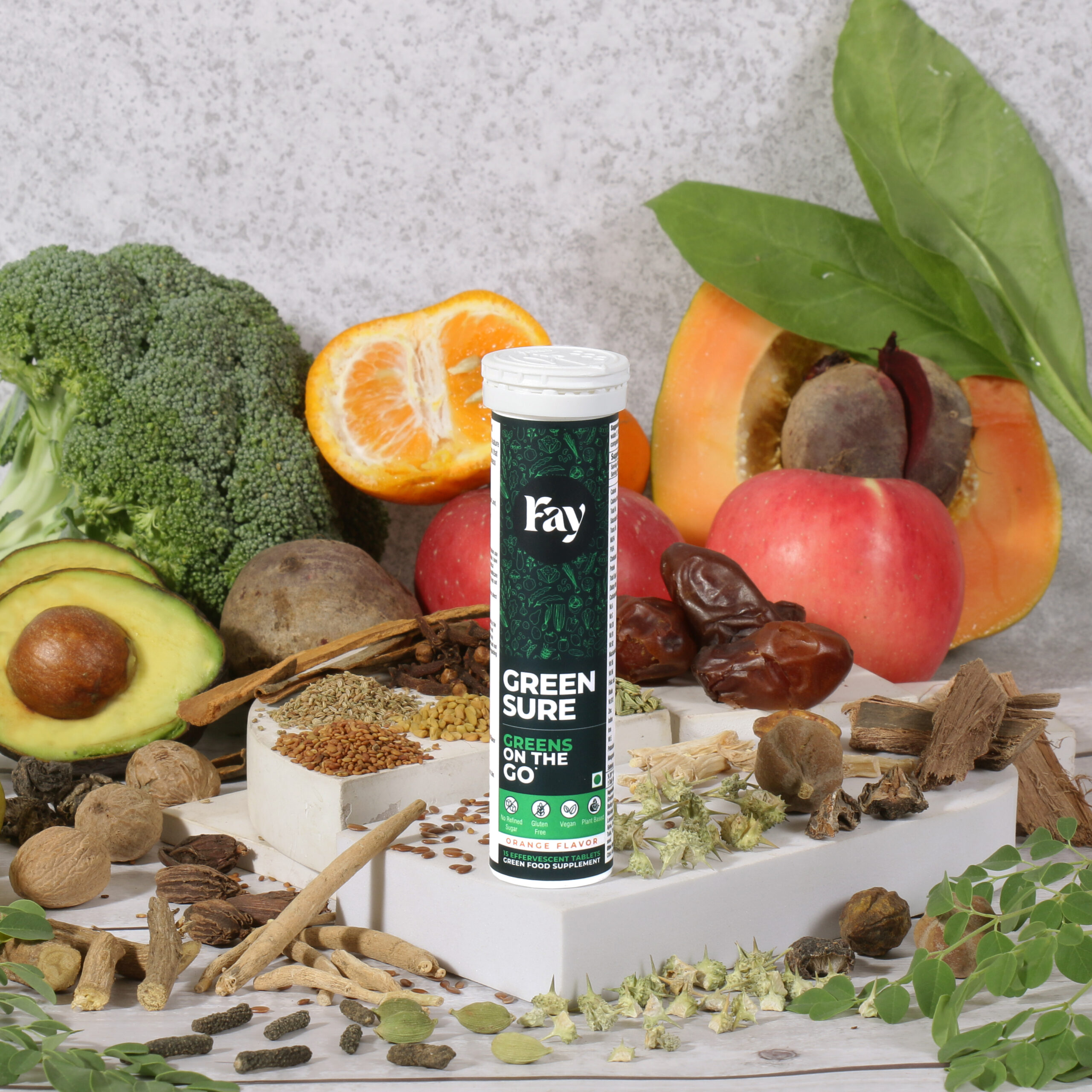 One tablet, twenty-four superfoods, zero effort. Fay Green Sure delivers a clean blend of greens, fruits, herbs, and antioxidants for everyday nourishment.